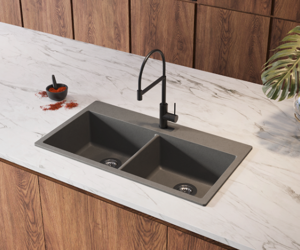 Na cozinha, o toque está ligado a ergonomia, higiene e controle acústico. Uma cuba de cozinha sofisticada em Duraquartz atenua ruídos de impacto, camufla gotículas e mantém a bancada visualmente organizada. O tato constante, sem porosidade desconfortável, facilita movimentos longos de lavagem e apoio de louças. O conjunto harmoniza com pedras naturais, superfícies compostas e ferragens de alto padrão, mantendo coerência entre funcionalidade e design.