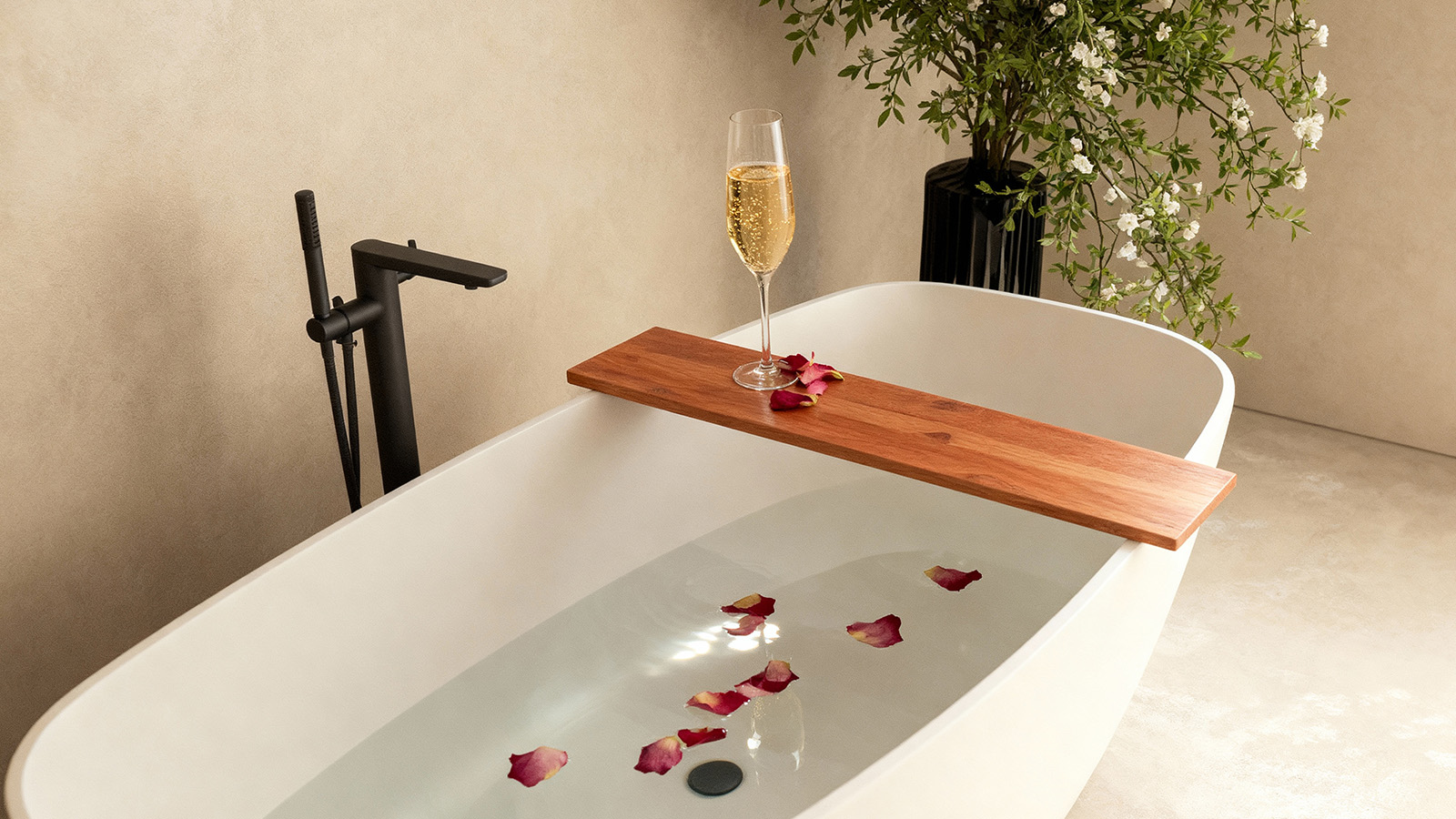 A Bandeja Lisa para Banheiras combina funcionalidade e design minimalista para complementar o espaço de banho com discrição e sofisticação. Sua estrutura em madeira natural cria um apoio prático e de alta durabilidade para apoiar seus itens essenciais de relaxamento, como livros, taças e óleos, com total segurança.